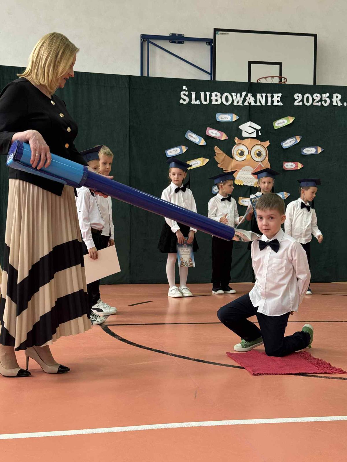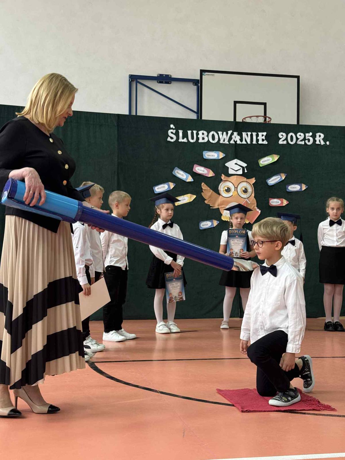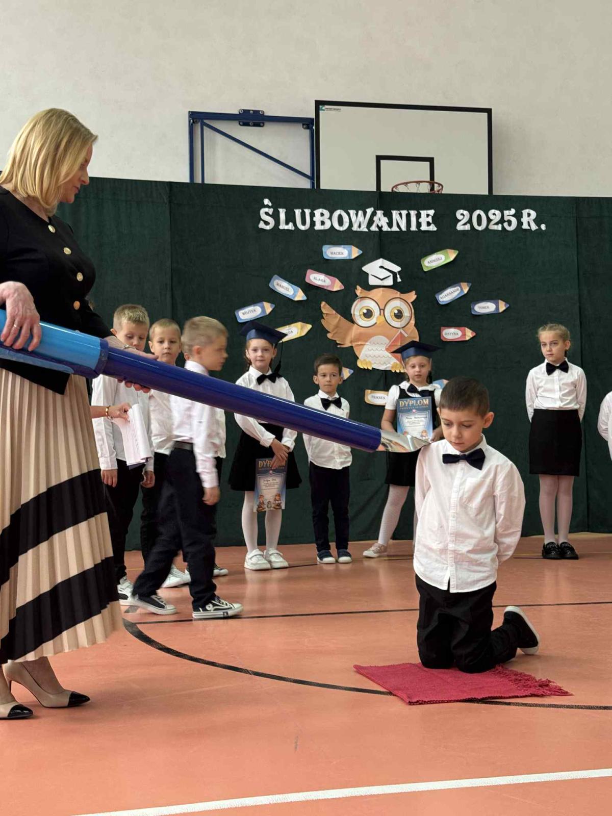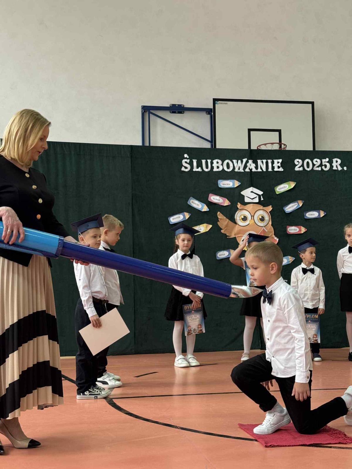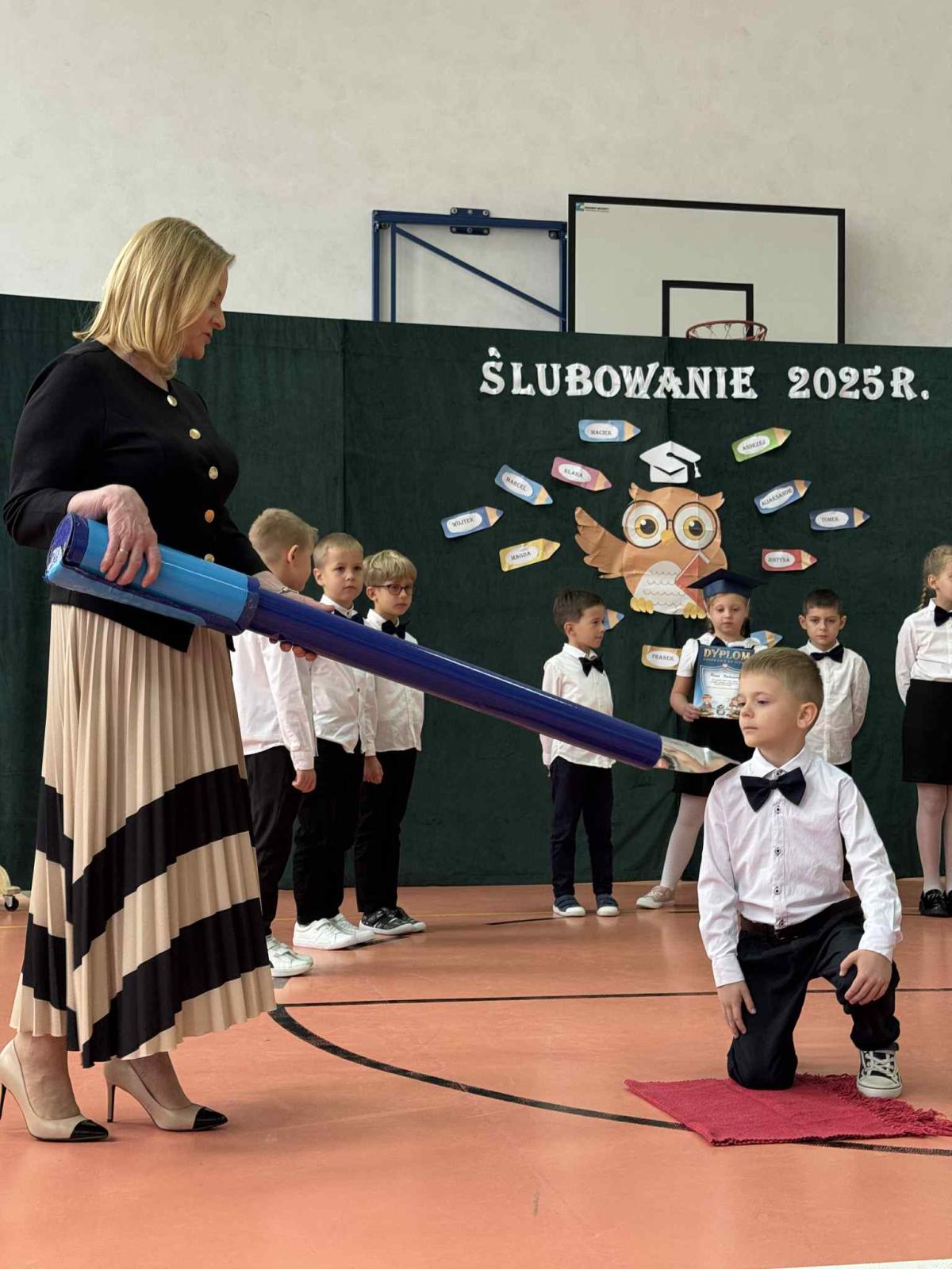 Podczas uroczystości uczniowie klasy pierwszej zostali przyjęci do grona uczniów. W trakcie akademii zaprezentowali swoje umiejętności, wyrecytowali wiersze i zaśpiewali piosenki. Przed pocztem sztandarowym ślubowali być dobrymi Polakami, godnie reprezentować swoją szkołę, swym zachowaniem i nauką sprawiać radość rodzicom i nauczycielom. Po złożeniu ślubowania pani dyrektor dokonała symbolicznego pasowania na ucznia. Po akademii dzieci udały się na „słodki” poczęstunek, przygotowany przez rodziców, którym serdecznie dziękujemy.